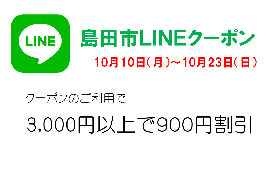 10月10日(月)~10月23日(日)まで、島田市公式LINEクーポンが使用可能です。ご利用いただけるクーポンは、「3,000円(税込)以上のご利用で900円割引」となります。