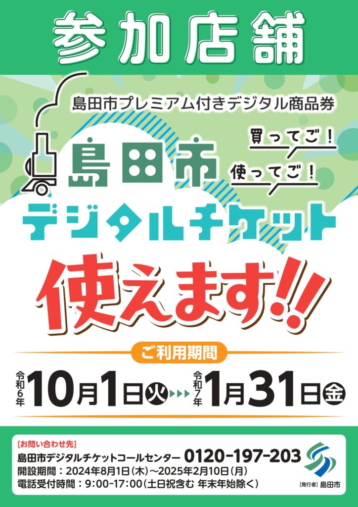 お知らせ 島田市プレミアム付きデジタルチケットがご利用いただけます 横井店・アピタ店・田子重店・金谷店で、島田市プレミアム付きデジタルチケットがご利用いただけます。 ご利用期間は、2024年10月1日~2025年1月31日 ぜひ、ご利用ください